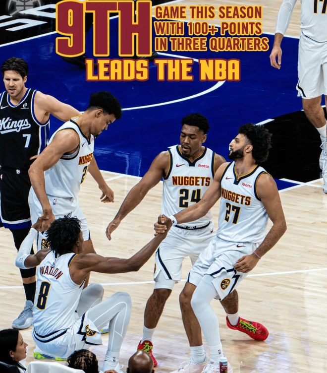 截止到第三节,掘金本赛季已经9次三节得分过百,同样高居全联盟第一位,一战连创两大神迹。此外,约基奇三节16中14,三分2中2独砍36分12篮板8助攻2抢断。